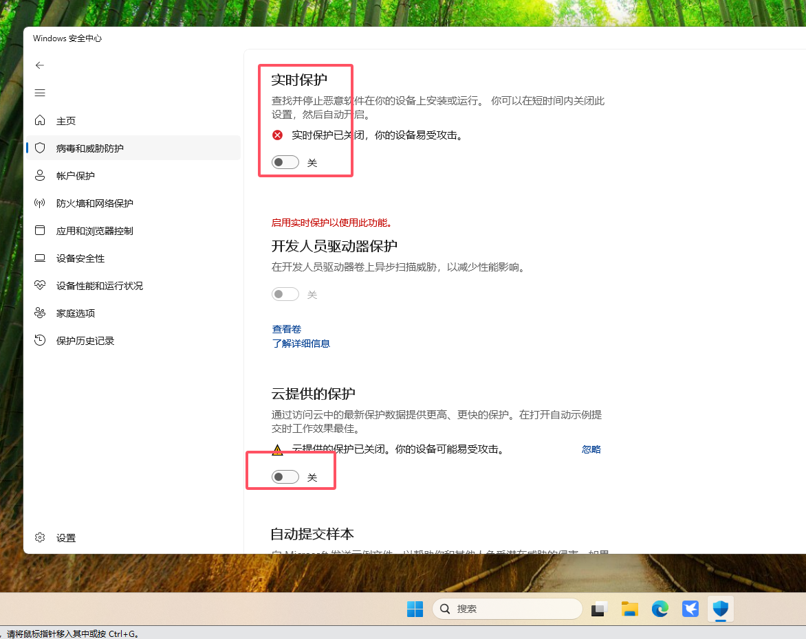 2. 打开安全中心-病毒与威胁防护-管理设置-实时保护,点击关闭。