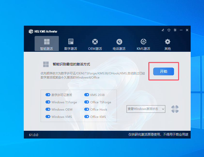 1. 打开主页面直接点击“开始”按钮,可自动激活系统和Office